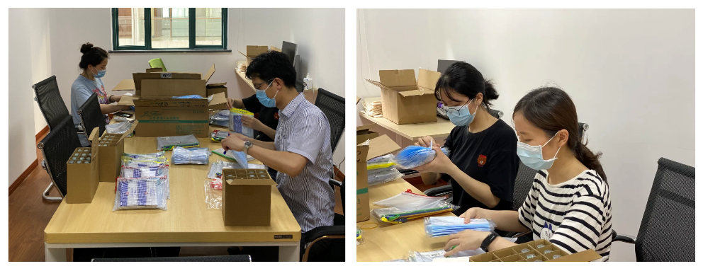 联合研究院副院长吴和林及教师志愿者们正在封装健康包