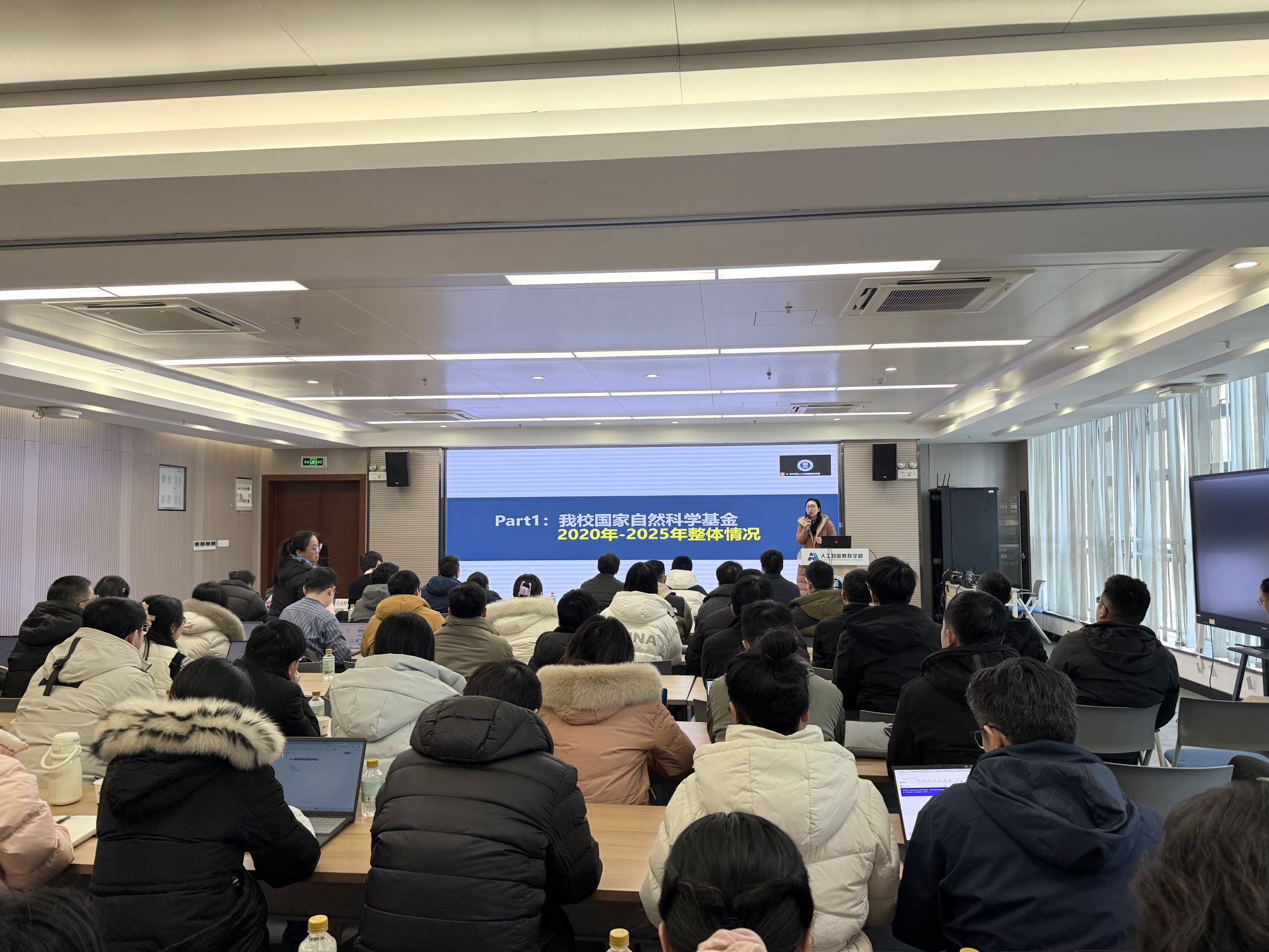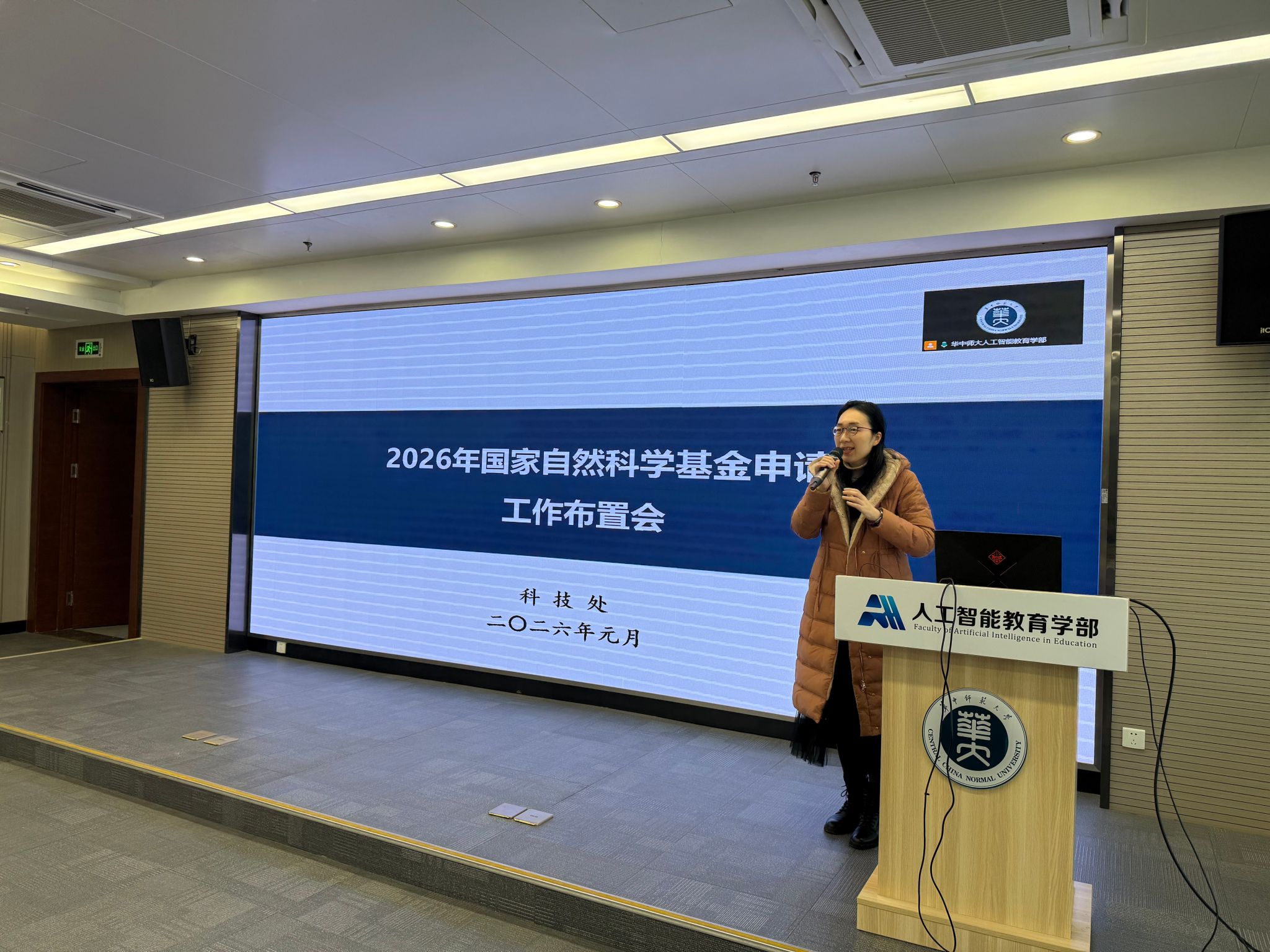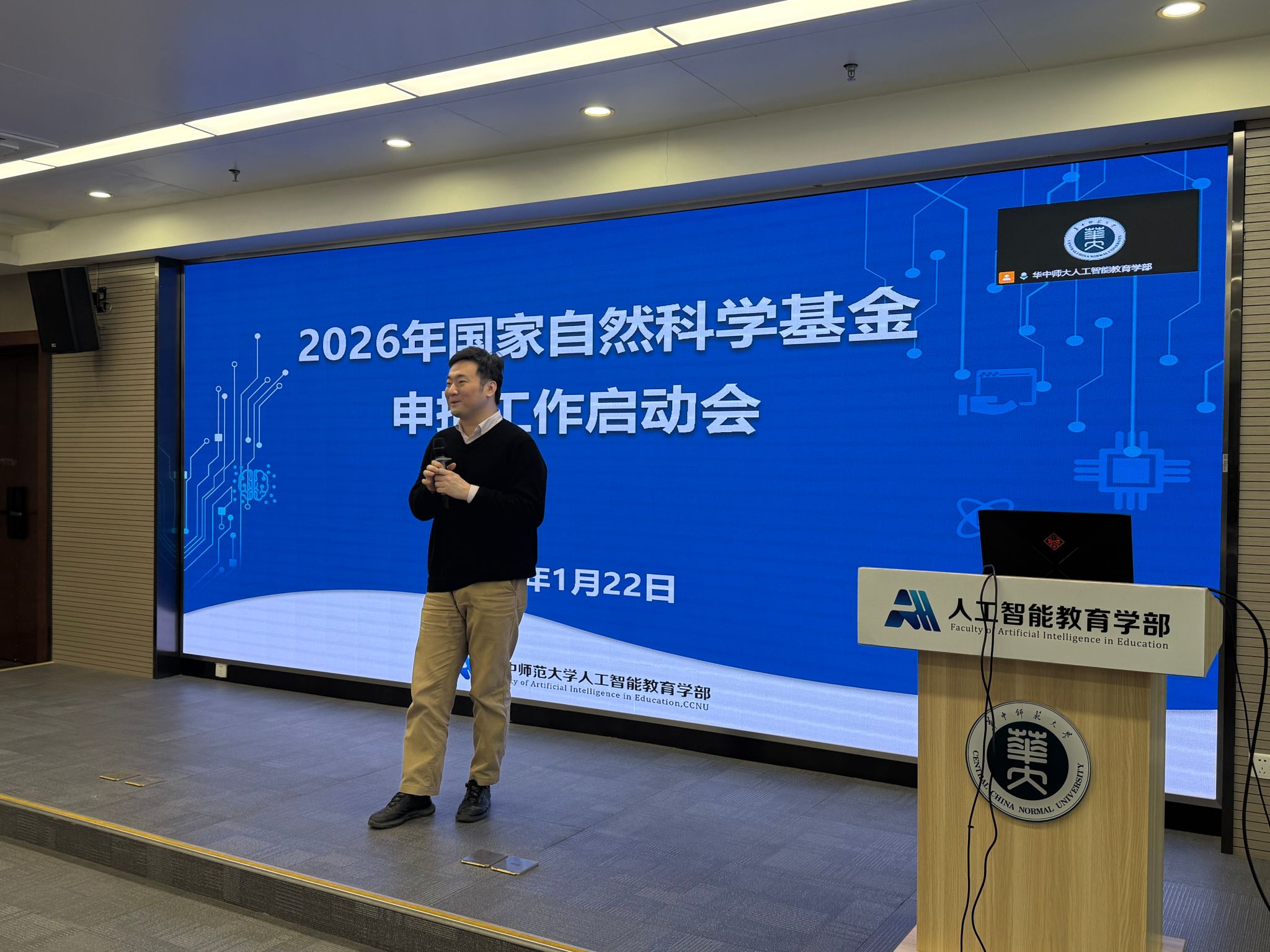 2026年1月22日,人工智能教育学部在南湖综合楼7001会议室召开了2026年度国家自然科学基金项目申报工作启动会。学部黄涛书记、吴砥副部长、人培办罗恒主任、科研办孙建文主任、董石副主任,拟申报2026年国自科基金的50余位教师及科研办全体人员参加了会议。会议特别邀请了学校科技处徐芬副处长、徐洪峰老师出席并作现场指导,并邀请学部王志锋教授分享申请经验。会议由学部科研办孙建文主任、董石副主任主持。