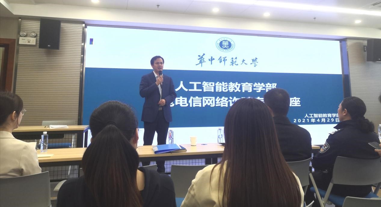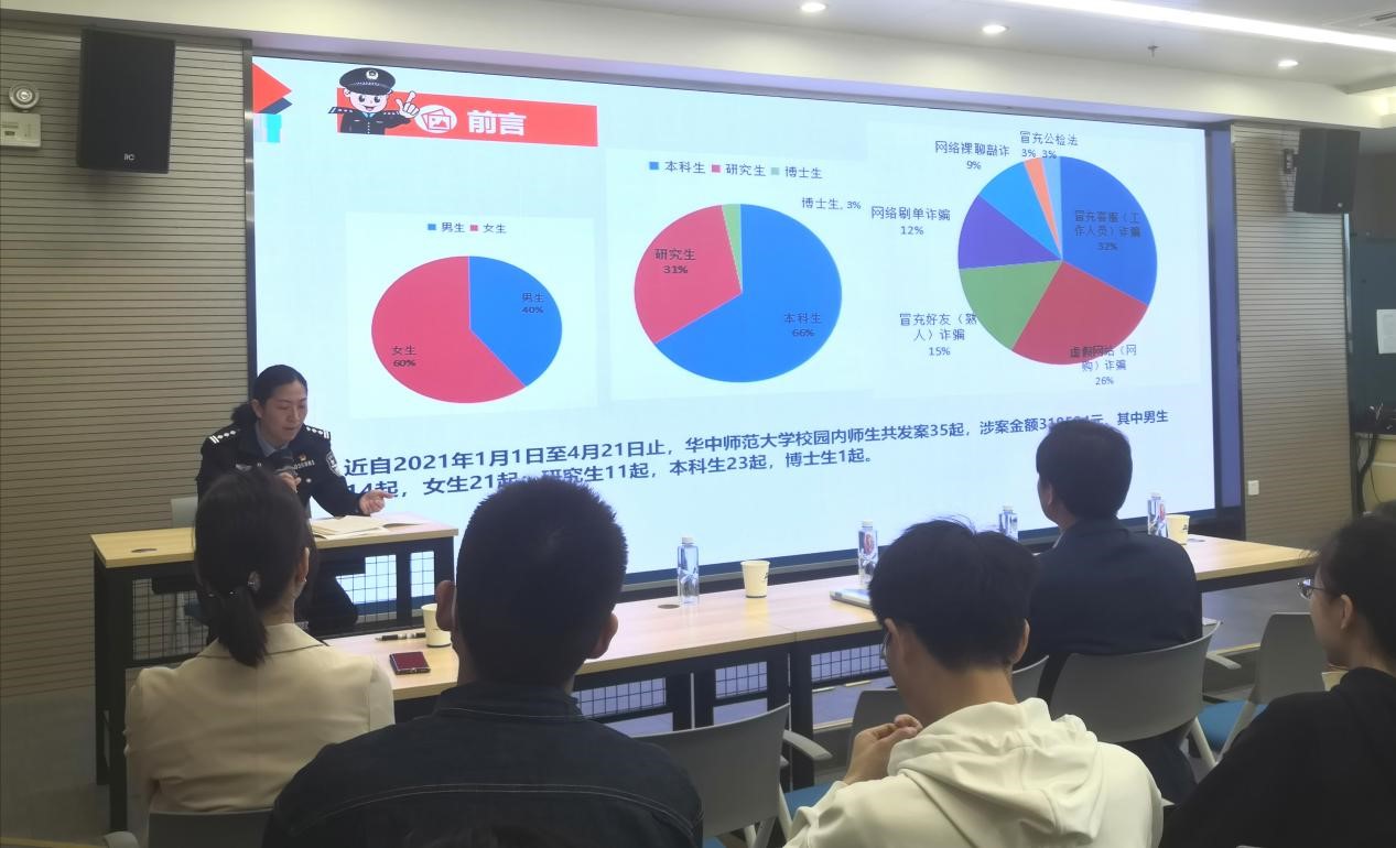 人工智能教育学部讯(通讯员刘梦凡)为增强学生安全防范意识,提高学生对电信网络诈骗手段的识别与防范能力,营造良好校园环境,4月29日下午2点30分,人工智能教育学部于南湖综合楼7001报告厅开展防范电信网络诈骗专题讲座,本次讲座采用线上线下相结合的方式举办。出席本次讲座的有洪山公安分局马房山派出所杨家慧所长、徐溢警官、刘文娟警官、华中师范大学校园治安综合管理中心治安办公室主任徐珏、人工智能教育学部党委副书记黄涛、人工智能教育学部研究生辅导员王潘,以及学部120余名学生代表,一千余名学部学生通过在线直播方式观看。本次讲座由杨家慧所长、徐溢警官和刘文娟警官主讲,人工智能教育学部研究生辅导员王潘主持。