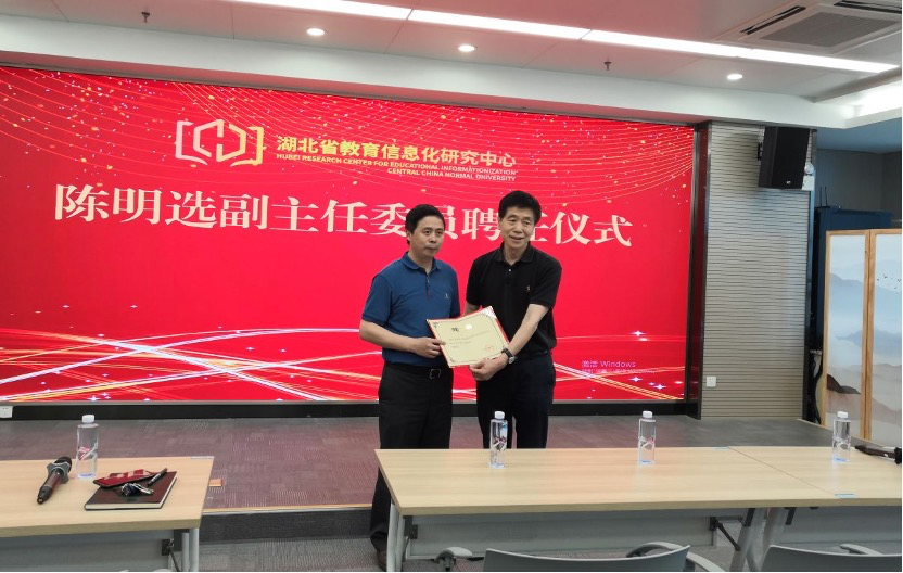 会议伊始,刘清堂教授向与会人员介绍陈明选教授的基本情况。陈明选现为江南大学教授,教育部教育技术学教学指导委员会副主任委员,教育部基础教育教材专家工作委员会委员,中国教育现代化面向2035规划专家组成员,中国教育技术协会信息技术教育专业委员会副主任委员,江苏省教学名师、江苏省哲学社会科学重点研究基地“互联网+教育”研究中心主任。接着为陈明选教授颁发湖北省教育信息化研究中心副主任委员聘书。