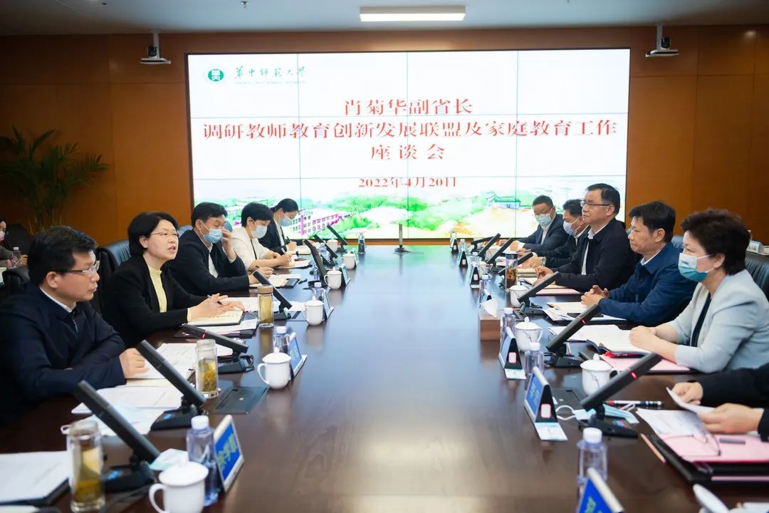 华大在线讯(记者 郝日虹 见习记者 狄圆圆)4月20日,副省长肖菊华来校调研湖北省教师教育创新发展联盟及家庭教育工作。她强调,要探索新时代湖北省教师队伍高质量发展路径,构建开放、协同、共生的教师教育发展机制,推动湖北教育高质量发展。