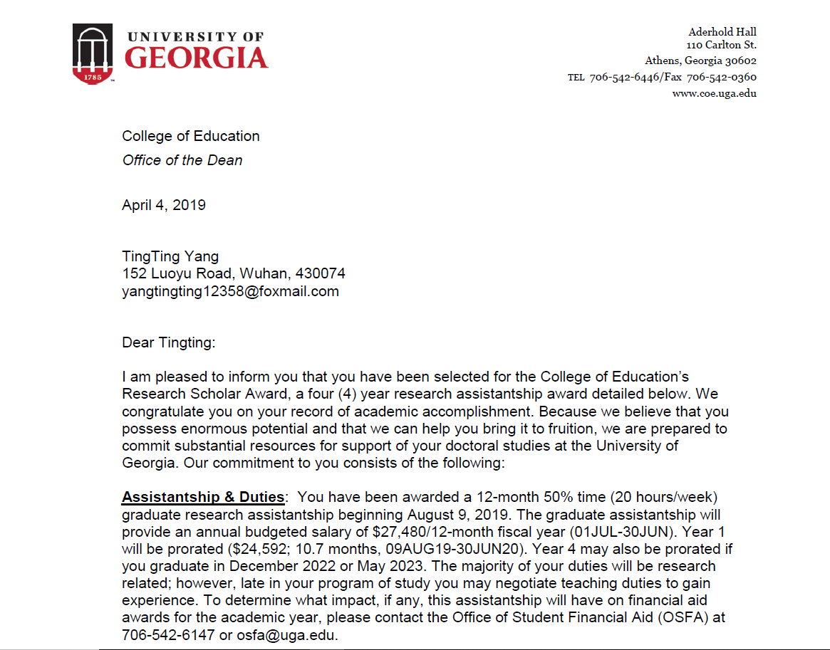 近日,教育信息技术学院2016级教育技术学专业研究生杨婷婷被美国佐治亚大学教育学院“学习设计与技术”博士项目录取,并获得了教育学院极具竞争力的Research Scholar Award奖学金。该奖学金包括博士四年期间学费全免及每年27480美元的生活补助,总金额超过20万美元。