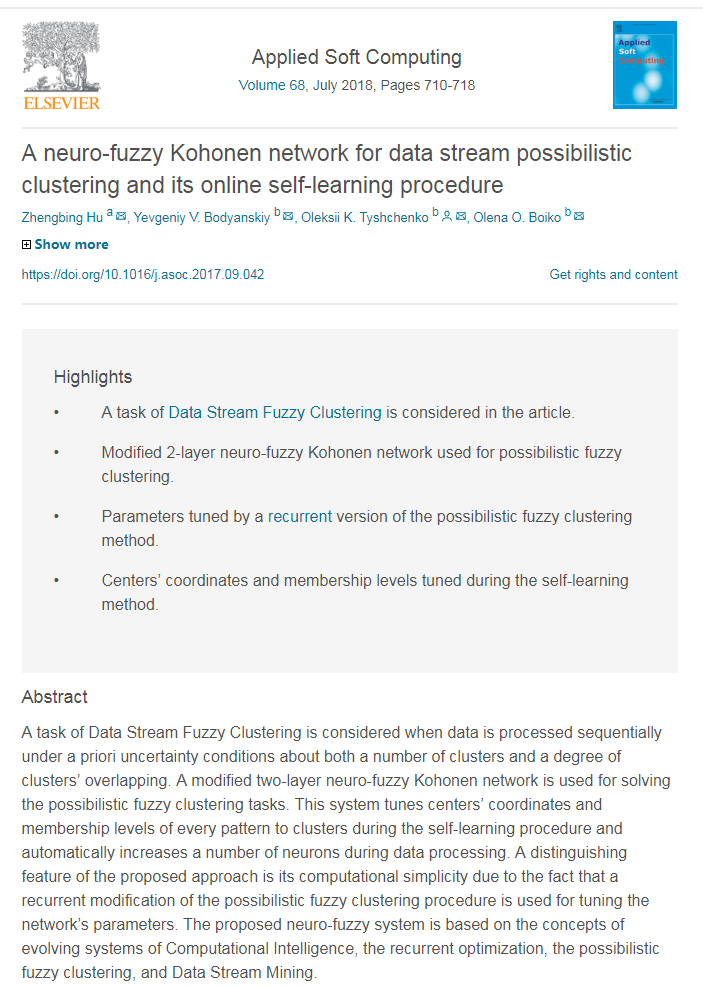 近日,我院教师胡征兵团队接连在计算机领域知名国际期刊上发表学术成果:《A neuro-fuzzy Kohonen network for data stream possibilistic clustering and its online self-learning procedure》(用于数据流可能性聚类的神经模糊Kohonen网络及其在线自学习过程)和《The Analytical Model for Distributed Computer System Parameters Control Based on Multi-factoring Estimations》(基于多因子分解估计的分布式计算机系统参数控制分析模型)两篇论文分别发表在Applied Soft Computing(SCI,2018年IF=3.907)和Journal of Network and Systems Management(SCI,2018年IF=1.750)国际期刊上。