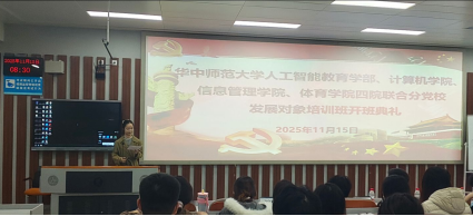 (通讯员:徐围)11月15日上午,人工智能教育学部、计算机学院、信息管理学院、体育学院联合分党校发展对象培训班开班仪式在南湖综合楼N319顺利举行。计算机学院党委书记王坤、信息管理学院党委副书记王涛、人工智能教育学部副处职组织员陈晓宇、计算机学院辅导员及带队老师赵丹、信息管理学院党务干事及带队老师薛莲、体育学院带队老师姜宝迪、人工智能教育学部党务干事及带队老师田璐出席开班仪式,开班典礼由人工智能教育学部现代教育技术硕士第二党支部书记乐三思主持。