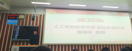 首先,人工智能教育学部副处职组织员陈晓宇为全体学员作动员讲话。他对各位学员们的到来表示热烈欢迎,并讲到参加本次培训的全体学员要深刻体会培训的意义、深化思想认识、提高理论水平,要高度重视入党教育培训,充分认识入党教育的重要意义。随后对大家提出了三点意见:一是要深刻领会发展对象集中培训的重要意义;二是要树立正确的入党动机,充分发挥模范带头作用,做到思想上、学习上、生活上入党;三是要端正学习态度,保证学有所获。同时,他也希望学员们要注重平时的学习,将此次学习视作新的起点,以此为开端,在今后进一步加强学习、主动自觉地持续提升自我。
