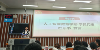 随后,人工智能教育学部硕士研究生杜研书作为学员代表发言。他呼吁同学们把家国情怀融入学习科研与工作实践,把使命担当体现在实干攻坚与不懈奋斗中;把个人理想融入国家战略,把人生价值写在民族复兴伟业之中,以昂扬精神状态投入学习与实践,为推进中国式现代化贡献青春与力量;杜研书同学在会上代表全体学员庄重承诺:将以满腔的热情和严谨的学习态度,全心全意投入到本次培训中。