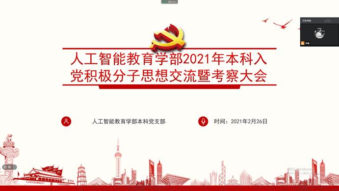 人工智教育学部讯 (通讯员 任梦璐)为规范发展党员工作,严格入党积极分子培养教育,保持党的先进性和纯洁性,根据《中国共产党章程》《中国共产党发展党员工作细则》《共青团推优入党工作实施办法(试行)》有关规定和发展党员工作有关流程、要求,结合学部《本科生入党积极分子思想交流和综合考察工作方案》具体安排,人工智能教育学部2021年本科生入党积极分子思想交流暨综合考大会于2月26日于腾讯会议线上举行。