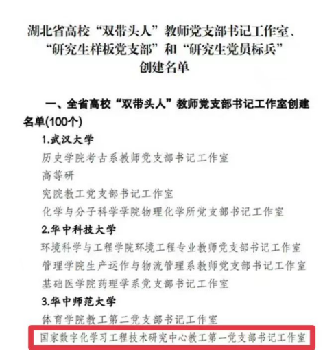 (通讯员:赵悦)近日,中共湖北省委教育工委公布了全省高校“双带头人”教师党支部书记工作室、“研究生样板党支部”和“研究生党员标兵”培育创建名单,学部国家数字化学习工程技术研究中心教工第一党支部成功入选全省高校“双带头人”教师党支部书记工作室创建单位,2022级教育技术学硕士研究生连世强成功入选全省高校“研究生党员标兵”创建名单。
