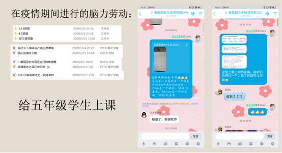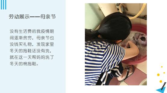 陈明慧同学也展示了疫情居家期间进行的一些劳动活动,此外,还向同学们介绍了王进喜、张秉贵、李素丽三位劳动模范和他们的事迹,并由此分享了自己感悟,“无论是有价劳动还是无价劳动,都是光荣且可贵的。”