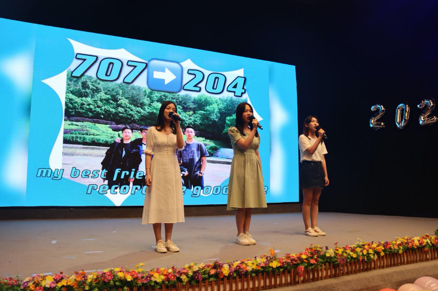 随着记录毕业感言的视频的播放,2021届毕业生重温青春过往并展望未来。视频过后,509寝室的女生带来的温馨合唱《房间》,她们借这首歌曲回忆自己的宿舍生活,回忆那个如同家一样温暖的地方以及那群胜似家人的可爱人们。1701班的学生带来新疆舞蹈《打起手鼓唱起歌》,她们穿着极具异域风情的新疆特色服饰,通过动感的音乐、明快的舞蹈为党献礼,同时表达着她们对家乡的热爱以及建设祖国的豪情。在合唱《干杯》和《亲爱的旅人啊》时,毕业生自发地随着歌曲节奏一起晃动手机歌唱。在第二次游戏过后是班主任对毕业生的寄语视频以及军训教官送上的祝福视频。