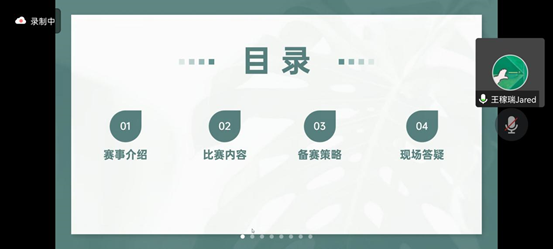人工智能教育学部讯(见习记者吴炜琴)为帮助同学们更加深入地了解大学生英语竞赛,提高同学们的英语素养,激发学部学子对英语类竞赛的热情,1月15日下午,人工智能教育学部于线上举办了2023年大学生英语竞赛培训活动。本次活动由学术科研部主办,王稼瑞担任主讲人,申若涵担任主持人。