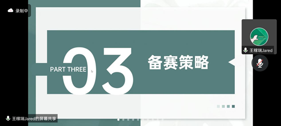 针对如何进行高效备赛,王稼瑞分享了许多具有实践性的经验。对于听力题型,他认为同学们要注重单词的积累,抓住听力的中心思想,还要适当地进行听力训练,提高听力能力。针对完型填空,王稼瑞指出大英赛的完型填空相比与高考,更加注重语境化、宏观化,考察了学生的积累能力和运用能力,需要同学们把握文章内容之间的关系。他指出,坚实的语法基础和词汇的运用是做好改错题的关键,同学们可以针对自身的语法短板进行选择性、针对性的语法学习。而针对作文题,王稼瑞的建议是同学们要打好单词基础,熟记常用模板以及要有清晰的行文逻辑,并通过学习范文来锤炼自己的语言。