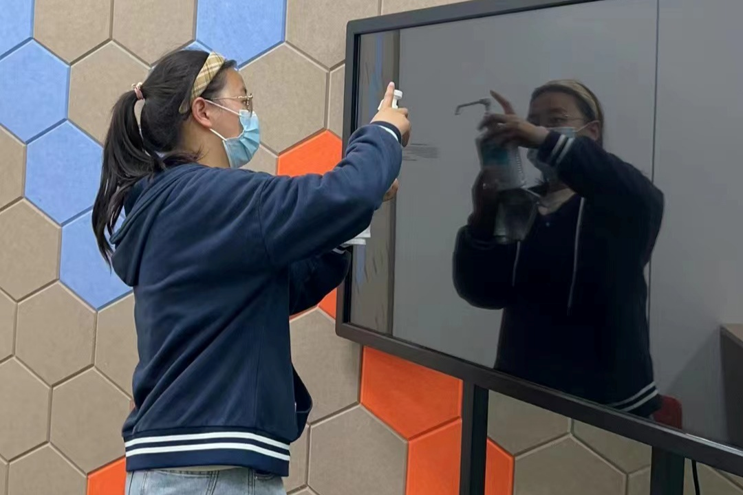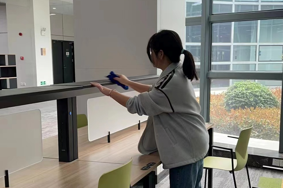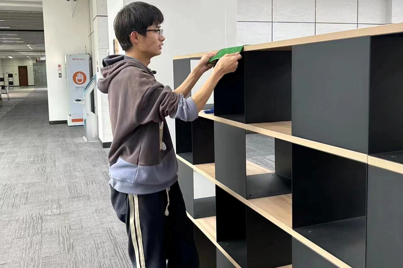 活动正式开始后,志愿者使用各自领取的抹布手套等工具分别到不同区域开展活动。志愿者们有条不紊地进行清扫任务,一部分志愿者拿着扫帚扫地,打扫图书馆的环境卫生,一部分志愿者拿着抹布擦拭桌椅板凳,图书架以及借还书仪器。他们在清扫活动中小心谨慎,确保图书馆仪器和设备的安全完好。在志愿者们一丝不苟的打扫后,图书馆的设施变得亮洁如新、书籍摆放得整整齐齐。