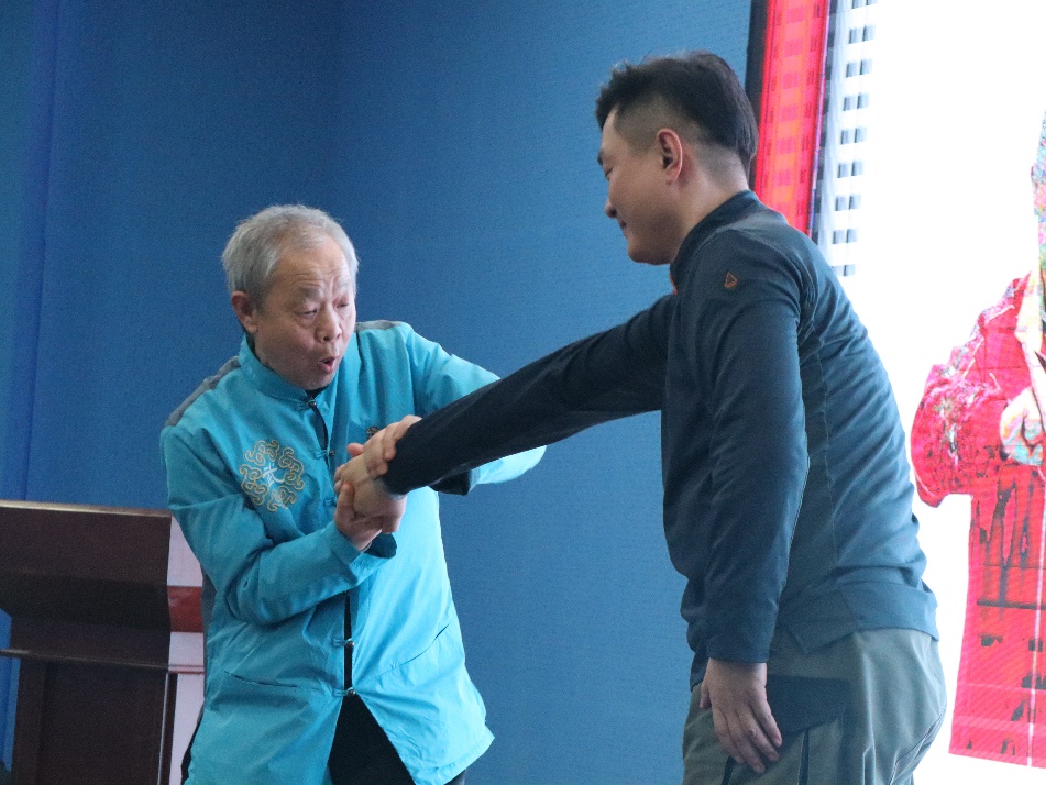 随后,郑勤老师登台,以中华传统武术的“抱拳礼”问候大家并开始讲解。