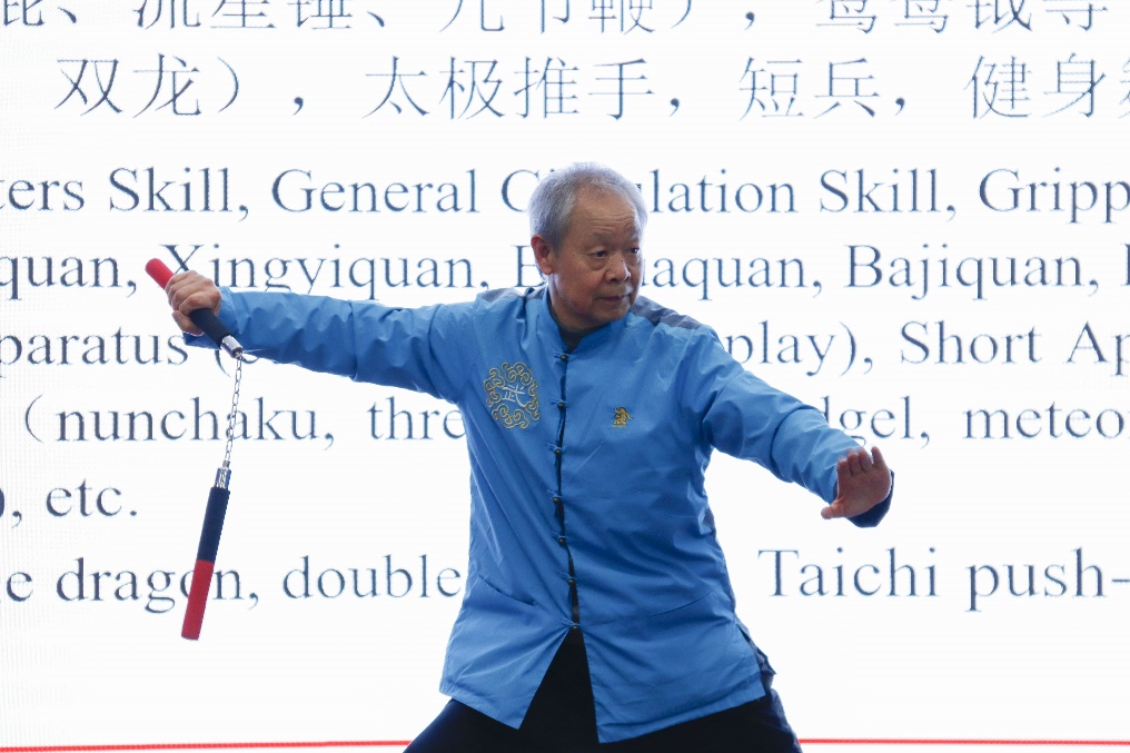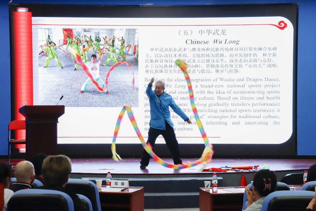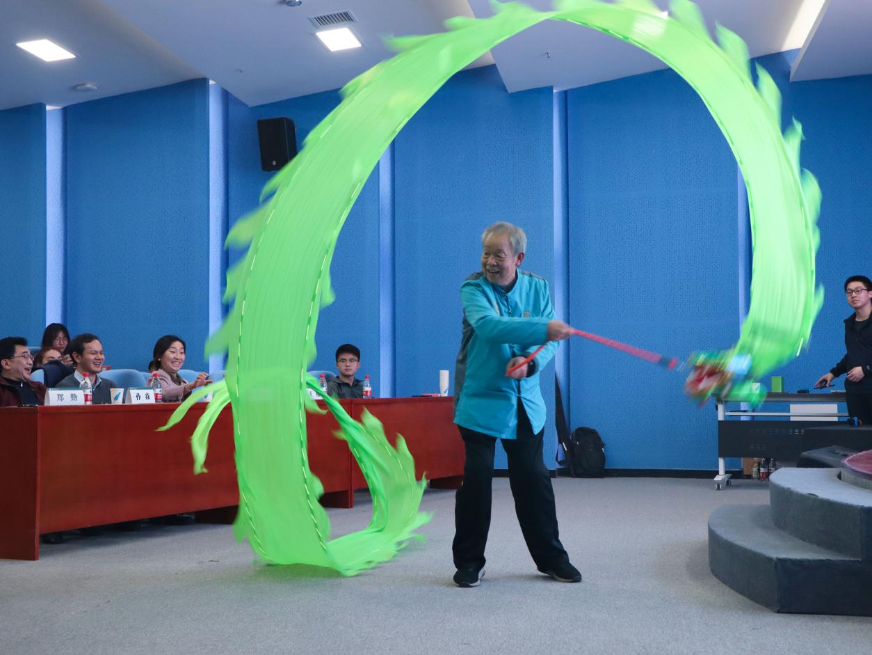 随后,郑老师展示了枪、棍、绳镖、中华武龙等武术器械。针对观众中有许多海外留学生,他使用中英结合的表述方式,有效提升了他们的参与感和体验感。观众们认真倾听,积极互动,在郑勤老师精彩的展示与风趣的讲演中频频送上掌声。