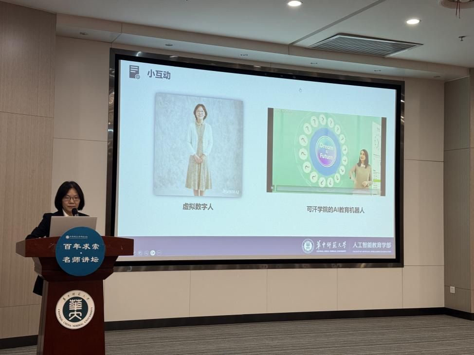 本次“百年求索·名师讲坛——智启课堂:大模型重构课堂教学新生态”主题讲座包括讲解、问答、合影三个环节。在讲解环节中,张老师首先提出了一个小问题:你眼中的未来教育是什么样的呢?短暂的思考后张老师给同学们播放了两段小视频,其中一段由AI生成的虚拟数字人高度还原了张老师本人,并进行了自我介绍,其形象、声音和动作都极为逼真。另一段视频展示了可汗学院研发的AI教育机器人的教学场景:它采用苏格拉底式的启发式提问,引导学生主动思考并自主解决问题。