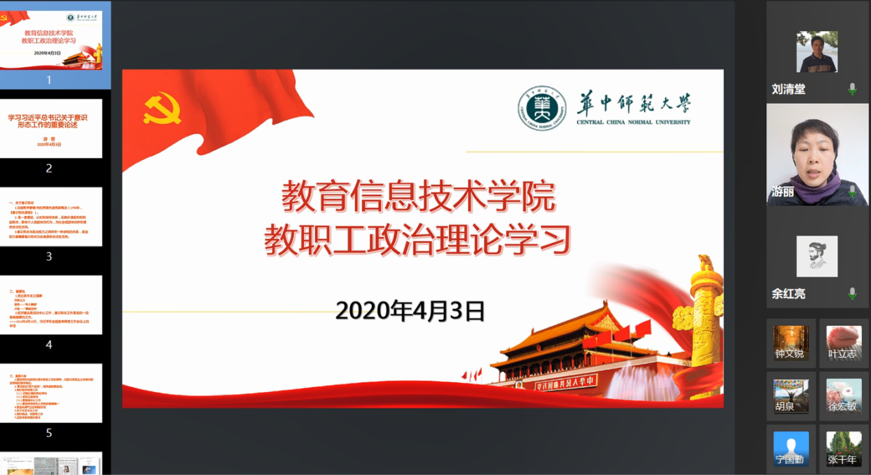 4月3日下午,信息技术教育学院以在线会议的形式召开全体教职工大会,总结前期工作,部署下步工作重点,举行了4月份教职工政治理论学习。院党政班子成员和全体教职工参加,会议由院党委书记游丽主持。