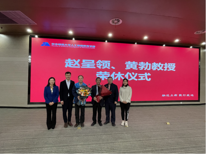 会上,举行了赵呈领、黄勃教授荣休仪式。首先,罗丽华介绍了2位老师的工作业绩及突出贡献,全体教师用热烈的掌声感谢他们的辛苦付出和默默奉献。随后,罗书记宣布学部将继续发挥两位同志的“老有所为”作用,聘请赵呈领教授担任人工智能教育学部发展顾问,继续聘请黄勃教授在文科综合国家级实验教学示范中心工作。副校长、学部部长夏立新教授为赵呈领教授颁发人工智能教育学部发展顾问聘书。接着,两位教授发表荣休感言,赵呈领教授指出自己是学科发展的见证者、学部建设的参与者、学习者、教育信息化的实践者、青年教师发展的支持者,他通过“五个身份”绘声绘色的讲述自己的人生经历和华中师范大学教育技术学的发展历程。黄勃教授以幽默风趣的语言讲述了自己与华师的缘分,表达了对学校和学部的感谢和美好祝愿,表示愿意为教师事业贡献一生。新进教师梁如霞、刘博文代表学部所有师生向两位老师献花,夏校长、罗书记上台与他们合影留念。