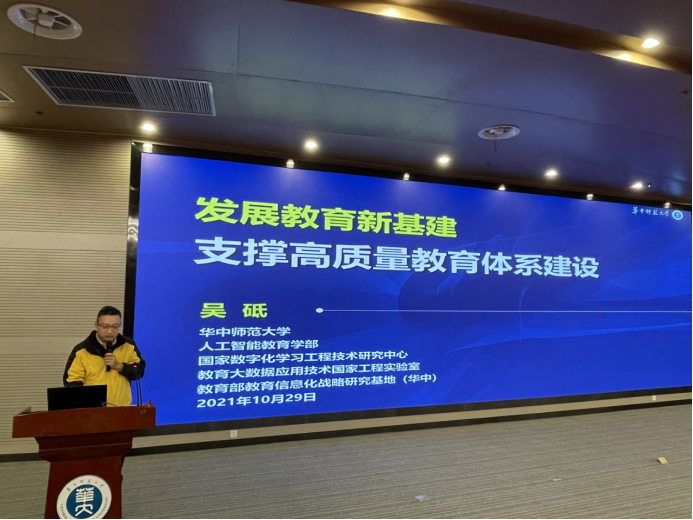 为推进学部党建工作与业务工作双融双促,创新教工理论学习和党史学习教育形式,丰富学习内容,推动事业发展,学部党委精心策划了党建与思想政治工作品牌项目“教育强国论坛”,定期邀请专家学者、领导干部为教工作专题报告。会上,举行论坛第一讲,学部国家数字化学习工程技术研究中心兼教育大数据应用技术国家工程实验室副主任吴砥教授作了主题为《教育新基建——高质量教育体系的支撑力量》的专题报告。首先,吴砥详细讲述了新基建的三大内容和七大领域,指出教育新基建的提出源自现实需要和政策要求,为高质量教育体系构建“数字基座”。随后,通过信息网络新型基础设施、平台体系新型基础设施、数字资源新型基础设施、智慧校园新型基础设施、创新应用新型基础设施、可信安全新型基础设施六个重点方向对教育新基建进行深入解读,强调保护隐私、提前预警、绿色上网。最后,吴砥对未来发展趋势进行展望,提出以差异化教学、个性化学习、精细化管理、数据驱动研究、智能化服务为目标,使教育新基建支撑高质量教育体系建设。