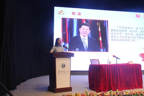 首先,夏校长介绍了习近平总书记关于教育重要论述的内容,指出“培养什么人、怎样培养人”始终是教育的永恒主题,也是一个政党坚持长期执政、一个国家实现长治久安需要思考的根本问题。我们党历来都重视人的培养这个问题,建国之后更加重视探索社会主义教育规律。在新中国70年教育发展的历史进程中,党的领导核心都突出强调了教育的重要性。他说,在全国教育大会上,习近平总书记把十八大以来教育改革发展中提出的一系列新理念新思想新观点,概括为“九个坚持”,这可以说是总书记关于新时代做好教育工作的集中阐述。其次,他阐述了立德树人是党对教育根本问题的时代性回答。他说,习近平总书记站在国家繁荣、民族振兴、教育发展的战略高度,多次就高校落实立德树人根本任务做出重要指示,从立德树人的极端重要性、实现立德树人的主要路径等方面进行了系统性论述。再次,他提出作为高等教育工作者,我们不能忘记高等教育的根本任务是立德树人,要始终牢记教育工作者的政治使命是“为党育人、为国育才”。围绕这个初心使命,夏校长提出着力构建大思政育人体系,在培养学生理想信念上下功夫;进一步深化教育改革创新,在构建高水平人才培养模式上下功夫;协同构建“五育并举”人才培养体系,在强化综合素质上下功夫;切实构建成长服务体系,在促进学生增长知识见识上下功夫,并详细谈了“四个下功夫”的具体思路和工作举措。最后,夏校长引用了习近平总书记的一句重要论述作了总结:“只有培养出一流人才的高校,才能够成为世界一流大学。办好我国高校,办出世界一流大学,必须牢牢抓住全面提高人才培养能力这个核心点,并以此来带动高校其他工作。”
