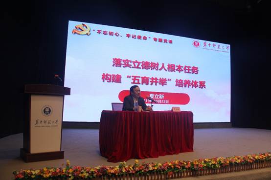 夏立新副校长围绕“落实立德树人根本任务,构建‘五育并举’培养体系”这一主题为在场师生讲了专题党课。党课分为两个部分,一是“学深悟透习近平总书记关于教育的重要论述,准确把握立德树人的重要内涵”,二是“不忘初心担当立德树人政治使命,统筹协同着力构建‘五育并举’人才培养体系”。
