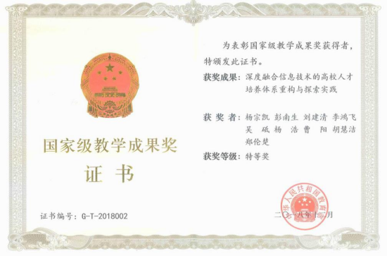 1994年国务院发布《教学成果奖励条例》,在高等学校中正式确立了由国家法规所确定的与科技“三项奖”所并行的国家级教学成果奖励制度。高等教育国家级教学成果奖是国家在教学研究和实践领域中颁授的最高奖项,每4年评审一次,体现了国家对高等学校教学工作的高度重视,展现了高等学校在教学建设、教学改革、人才培养等方面所取得的成绩。其中,特等奖是最高奖,每届只有2项,竞争非常激烈。2018年,国家级教学成果奖的申报和评选工作如期开展,我校以“深度融合信息技术的高校人才培养体系重构与探索实践”为主题,成功获评高等教育国家级教学成果特等奖。这是在教育技术学科发挥主干牵引作用的情况下,高等学校获得的第一个国家级教学成果特等奖。