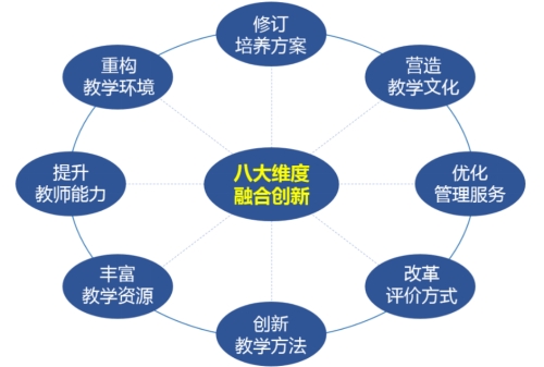 我校是较早启动信息化教改的高校,早在2012年即获批为教育部首批信息化试点高校。学校贯彻以教育信息化带动教育现代化的总体思路,将信息化列为学校基本战略,坚持全面推进信息技术与教育教学深度融合研究,重点针对信息时代人才培养的三大问题进行实践探索:一是如何充分发挥信息技术优势,构建信息时代以学生发展为中心的高校人才培养体系;二是如何利用信息技术共享优质资源、创新教学方法,借助教育大数据解决教学活动中规模化与个性化的矛盾;三是如何营造信息时代高校重视教学、崇尚创新,善教、乐教的文化氛围。
