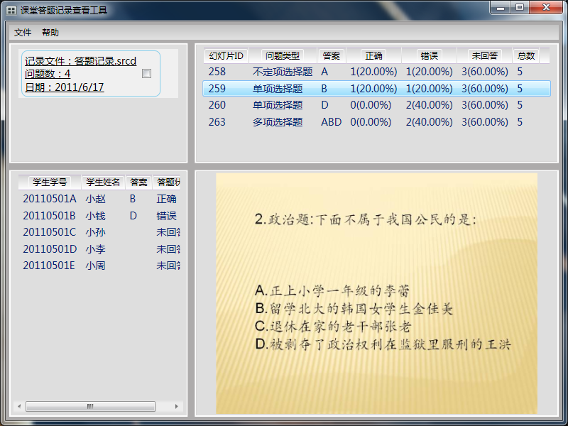 3 after classTeachers use classroom record viewing tool toview and count answer record file. In addition to classroom applications, thesystem is also applied to include interactive entertainment, conference voting,electing personnel, project evaluation and coneitec score.