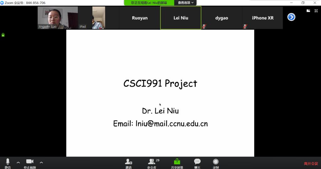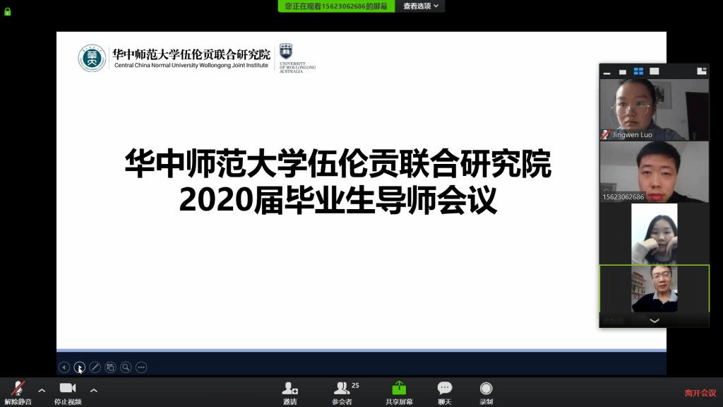最后,所有导师们根据目前毕业生毕业论文进展情况提出的问题与建议。吴和林表示,学校高度重视今年毕业生的毕业和就业工作,制定了切实可行的方案。联合研究院也制定了《华中师范大学伍伦贡联合研究院2020年上半年学位论文相关工作方案》。为此,学院和各位导师将按照学校的要求,结合学院的实际,有序突进2020年毕业论文评审及答辩工作。对于因为疫情防控期间出现更多的个别情况将予以密切关注,希望各位导师多关注、多督促、多帮助,共同做好2020年学位论文答辩相关工作。