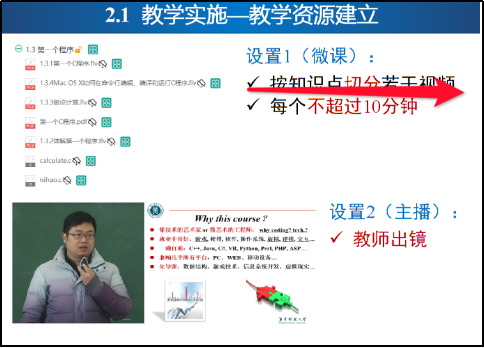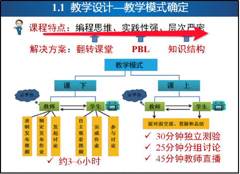 而后,王志峰老师结合自己《C语言程序设计》课堂,从教学设计、教学实施、教学研究三个方面分享了自己在线教学体会。王老师谈到,教学设计工作至关重要,要依据课堂特点确定教学模式、做好开课前做好调研、根据课堂需要选择好教学平台;交流了在教学实施中教学资源建立、测验+作业驱动、教学小技巧及辅助教学工具等具体做法;分享了在教学研究中关于知识认知结构和挖掘、认知诊断+教学资源推荐系统、课程信号灯等研究经验体会。