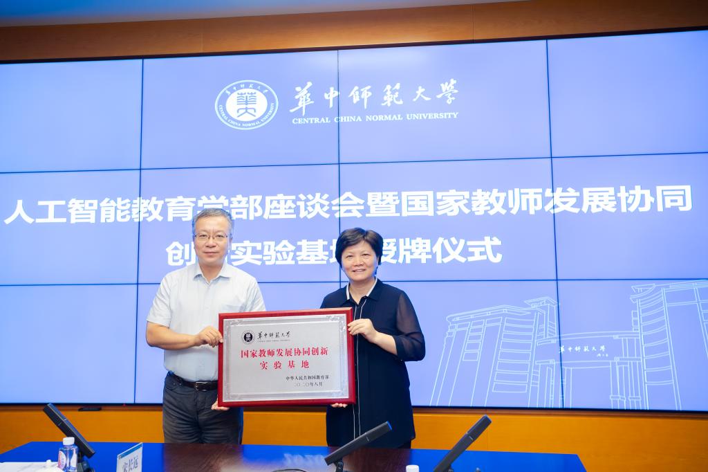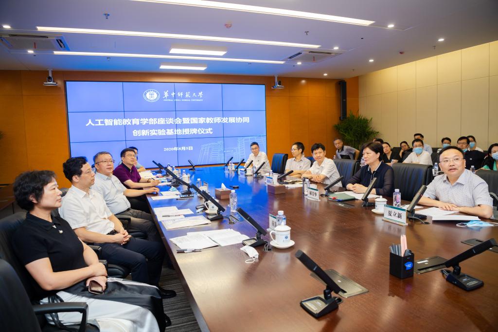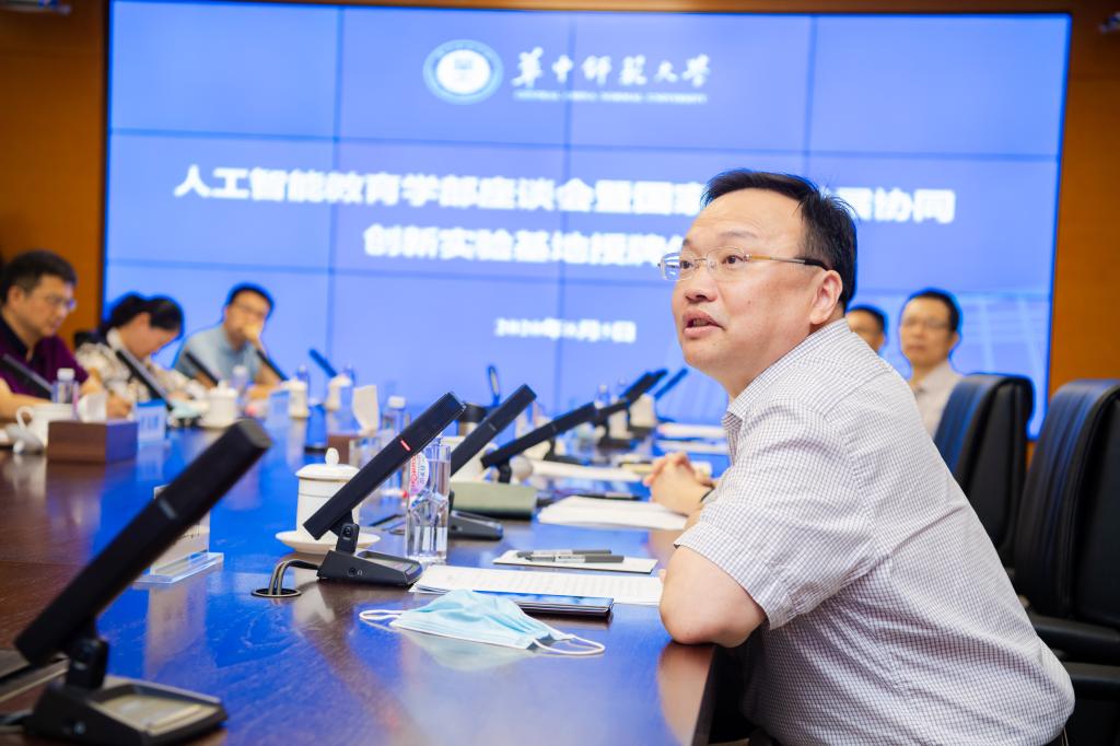华大在线讯(记者 郝日虹 毛军刚 通讯员 王俊)8月5日,教育部教师工作司司长任友群、副司长黄伟,湖北省教育厅副厅长余学敏及相关人员一行6人,来校调研人工智能教育学部和国家教师发展协同创新实验基地建设情况,并在南湖综合楼与我校党委书记赵凌云,校长郝芳华,西安电子科技大学校长、人工智能教育学部学术委员会主任杨宗凯,副校长、人工智能教育学部部长夏立新,副校长李鸿飞以及学部相关负责人座谈。座谈会期间,任友群为国家教师发展协同创新实验基地授牌,郝芳华代表学校接受基地牌匾。