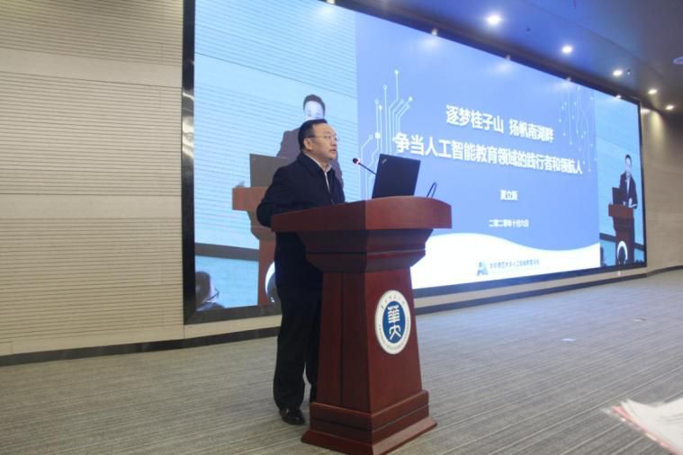 典礼第一项,由副校长、学部部长夏立新教授讲话。他以“逐梦桂子山,扬帆南湖畔,争当人工智能教育领域的践行者和领航人”为主题,为2020级全体新生开讲“第一课”。在报告中,他首先对2020级新同学表示了热烈的欢迎并介绍了人工智能教育学部的成立背景、发展目标、发展措施,指出作为学部首届新生,同学们是当之无愧的“南湖一期”,肩负着与学部同呼吸共命运的重任。他希望同学们保持纯真之心,高扬理想风帆;常怀感恩之心,永葆家国情怀;坚定探索之心,勇担时代责任。最后他用“师者率先垂范,后浪勇往直前”这句话勉励同学们努力奋斗,为学部、学校和国家的发展贡献青春与智慧。