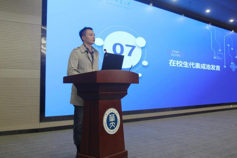 典礼第七项,由教师代表郑旭东教授发言。他首先通过简单讲述自己在华师的经历表示希望同学们在经过四年学习后可以对人工智能和教育有自己的体会,之后讲述了自己对“忠诚博雅,朴实刚毅”的华师精神的理解,希望同学可以做一个忠诚博雅、朴实刚毅的人。