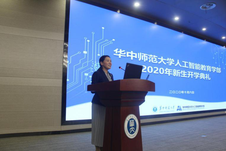人工智能教育学部讯(记者郑雪织 黄赏)2020年10月6日晚,人工智能教育学部2020年新生开学典礼在南湖综合楼一楼学术报告厅举行。副校长、人工智能教育学部部长夏立新,学部罗丽华、刘清堂、何静、余新国、钟文锐、黄涛、左明章、童名文、吴军其、吴梦文、吴和林等领导以及教师代表、班主任等出席,2020级新生以线上线下相结合的方式参加典礼。典礼由人工智能教育学部党委书记罗丽华主持。