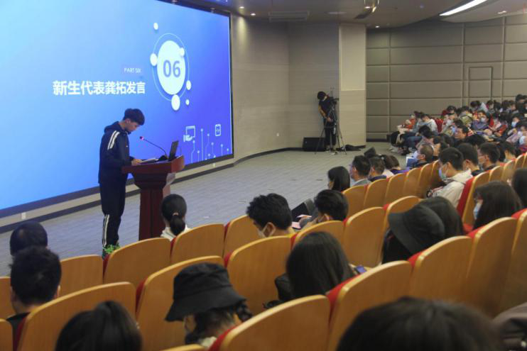 典礼第五项,由新生代表龚拓发言。他首先对入学以来引导和帮助新生的老师们和学长学姐表示了感谢,表达了自己走入大学后的感受,并他提出了自己对大学的展望。