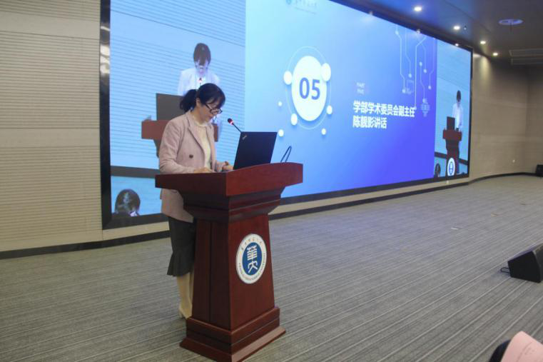 典礼第四项,由学部学术委员会副主任陈靓影教授由介绍学生学术规范和学术标准。她首先介绍了本科生和研究生的学术规范,之后介绍了研究生需要掌握的基本学术能力并介绍了硕士生和博士生需要掌握的的研究能力,最后介绍了研究生和博士生的毕业标准。