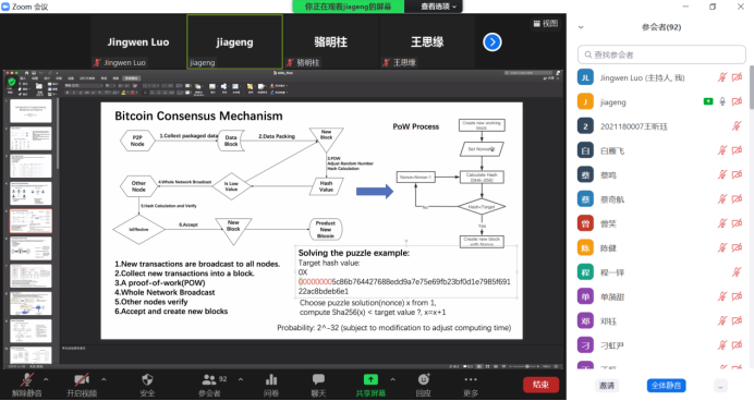 陈嘉耕副教授讲述了近几年火热的电子货币的相关知识,拨开了比特币的神秘面纱,让同学们透过感性的狂热,理性的了解了电子货币背后的一些理论基础。陈老师以最热门的比特币为例,讲述了区块链技术在电子货币中如何应用。