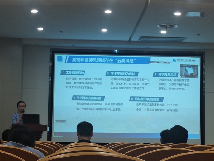 会议还开展了党风廉政和师德师风警示教育。学部党委副书记、纪委书记邓飞传达了学校《关于开展违规吃喝问题专项整治工作的通知》,通报了近期发生的4起违规吃喝和收送礼品礼金典型案例,并结合党纪学习教育相关工作要求,解读了6起违反党的纪律典型案例,为广大教职工敲响廉洁自律的警钟。学部党委副书记李娜带领教职工学习了《新时代高校教师职业行为十项准则》,深入剖析了我校师德师风领域存在的“五类风险”,通报了违反工作纪律、生活作风以及违法违纪的师德失范典型,教育警醒教职工以案为鉴,守牢底线。