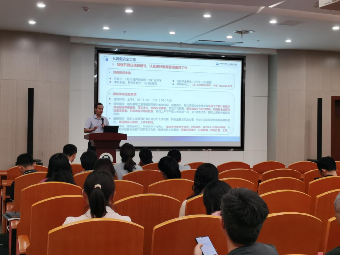会议最后开展了暑期安全教育。学部党委书记黄涛对加强节假日值班值守,认真做好假期管理服务工作,严格落实学校实验室安全管理提出了要求,希望各位辅导员、导师、班主任做好留校师生的安全教育和管理,增强师生安全防范意识、高度重视暑假安全工作。