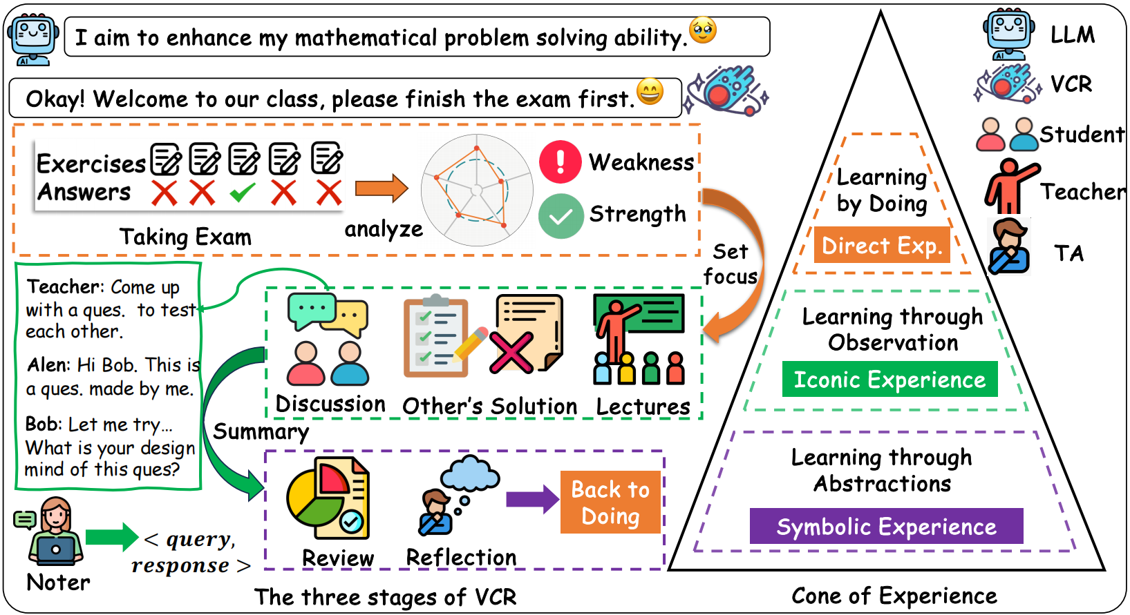 研究成果“VCR: A ‘Cone of Experience’ Driven Synthetic Data Generation Framework for Mathematical Reasoning”被人工智能国际顶级会议AAAI《The 39th Annual AAAI Conference on Artificial Intelligence》正式接收录用。大语言模型在自然语言处理方面性能出色,但面对数学推理往往存在较大挑战。随着训练模式的逐渐固化,学术界提出以数据为中心的人工智能思想,强调开发更高质量的数据以增强大语言模型性能。现有研究扩展数据集构建面向数学推理的合成数据,进而监督微调大语言模型。这类方法大多关注数量而忽视质量,具有挑战性的样本在数据合成过程中没有得到充分的考虑,导致数据构建成本高、密度低、同质化严重。该成果提出了一种名为Virtual ClassRoom(VCR)的多智能体环境,利用大语言模型驱动多种智能体角色构建高质量、多元化的合成数据。基于“经验之塔”理论,VCR类比人类学习,在数据合成过程中引入三个层次的经验,精心设计了用户友好的指令集和角色扮演系统,使VCR能够自主规划合成数据的规模。该系统实现了包括讲授、研讨、问题设计、问题解决等多种教育场景的自主模拟。多个实验表明VCR生成的合成数据具有更高的质量密度和泛化能力,能够以较小的训练代价提高大语言模型的数学推理性能。