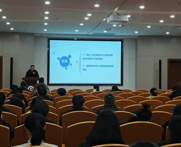 学部党委副书记邓飞传达了学校《关于做好2025年春节期间正风肃纪工作的通知》,通报了3起违反中央八项规定精神典型问题,希望广大教职工引以为戒,绷紧纪律作风之弦,锲而不舍落实中央八项规定精神,确保在春节期间“不松动”,过好“廉节”,营造清正廉洁的节日氛围。
