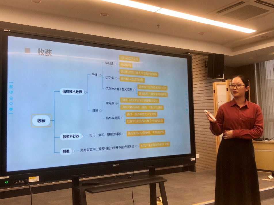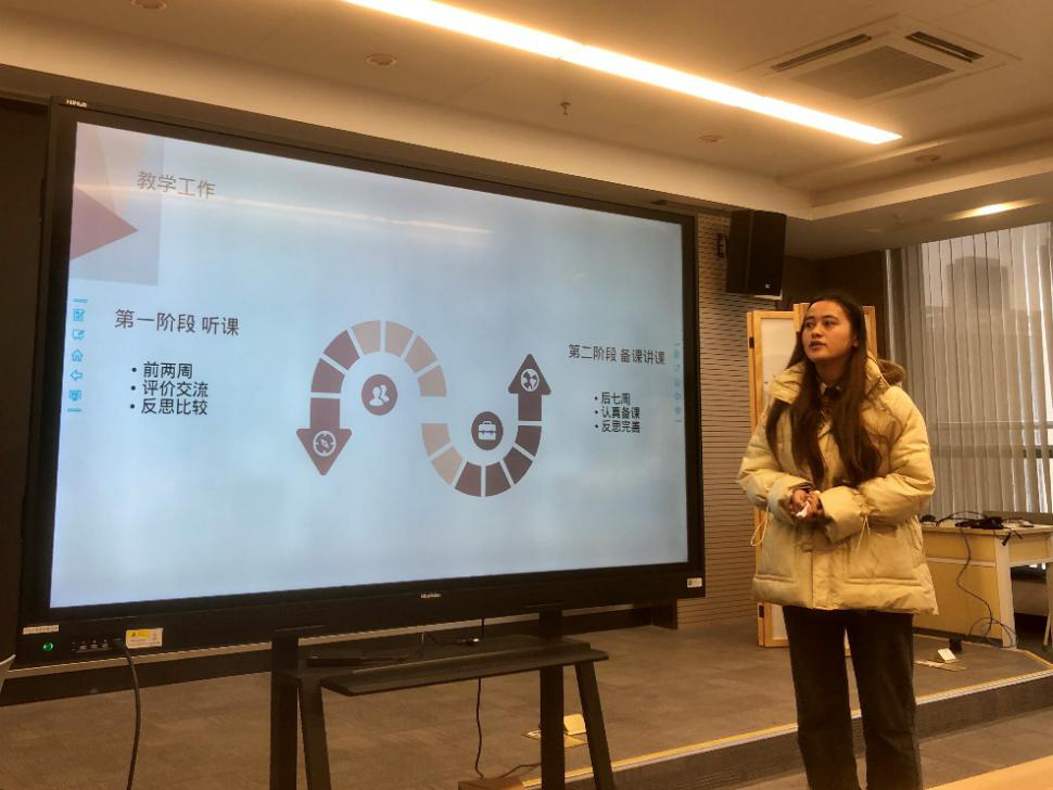 随后,各位实习生依次上台,从自己的实习经历出发,结合实习期间的所见所闻,从学校基本情况、教育教学工作、班主任工作、实习反思、收获感悟等方面,与在场的老师同学们分享了他们初为人师的成长历程,对实习期间指导教师的耐心指导表示感谢。分享过程中,同学们也就如何通过专业学习提升个人核心竞争力等问题提出了自己的见解与思考。