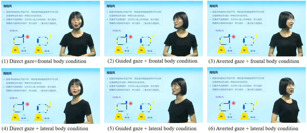 题目为《Instructor presence in video lectures: Eye gaze matters, but not body orientation》于2020年1月10日发表于Computers & Education(SSCI一区,IF=5.672)。该研究聚焦于视频课程中的教师目光及身体朝向,运用眼动追踪技术比较了教学视频中,教师目光引导和身体朝向对学习者注意分配和学习效果的影响(教学视频如图1所示),发现引导目光更利于学习,而身体朝向无影响。