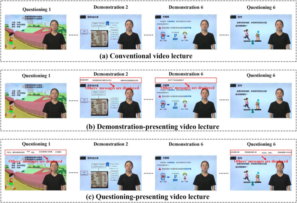 题目为《Seeing others’ messages on the screen during video lectures hinders transfer of learning》于2020年4月11日发表Interactive Learning Environments(SSCI二区,IF=1.929)。该研究通过眼动追踪技术探究了视频课程学习过程中,在不同教学环节(知识讲述环节、提问环节)进行的社会性交互活动对学习者学习效果和注意投入的影响,社会性交互又是如何影响学习者的学习成绩和注意力的(教学视频如图3所示)。社会性交互在本研究中特指学习者通过视频课程中的社交功能进行探讨交流,比如弹幕。结果发现,无论在知识讲述还是提问环节,视频课程中嵌入社会性交互都会对学习者的注意力和学习效果产生消极影响。