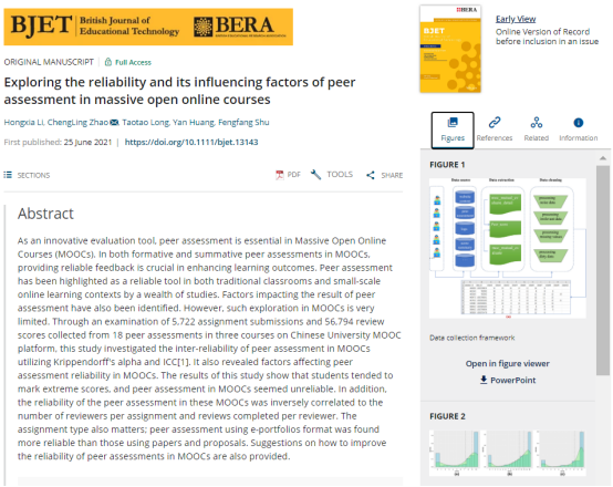 人工智能教育学部讯(通讯员李红霞)近日,人工智能教育学部赵呈领教授及其指导的博士生李红霞、青年教师龙陶陶等撰写的《Exploring the Reliability and Its Influencing Factors of Peer Assessment in MOOCs》一文被教育技术学学科重要国际期刊British Journal of Educational Technology录用,于2021年6月25日在网络上提前出版。文章地址:http://doi.org/10.1111/bjet.13143。