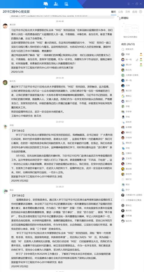 本次会议由2019级研究生支部书记郑超主持,黄涛副书记应邀参加本次会议。在会上,郑超同志通过视频的方式与同学们一起观看了16日新闻联播“习近平回信勉励北京大学援鄂医疗队全体‘90后’党员 让青春在党和人民最需要的地方绽放绚丽之花”视频。观看后,同学们相互交流,踊跃发表自己的感想和体会;同月26日党员同志们在线上讨论习近平总书记在湖北省考察新冠肺炎疫情防控工作时的重要讲话精神并发表自己的学习体会,同时大家也学习了《华中师范大学2020年工作要点》,了解到了学校未来五年的规划。