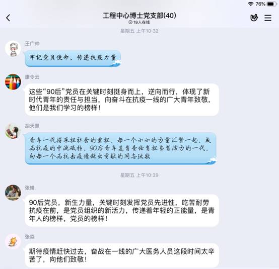 随后,与会党员就学习内容展开热烈讨论,发表感想。各位党员表示将以这些“90后”党员为榜样,响应总书记的号召,不断勉励和鞭策自己。邢单霞同志表示:“‘90后’已不再是曾经长辈眼中的稚嫩少年,青年一代逐步成长为可以勇担重任的蓬勃力量。青年人应‘心系天下,脚踏厚土’,让本领在实践中获得磨砺,让理想在初心中生根发芽,正如习近平总书记所说:‘让青春在党和人民最需要的地方绽放绚丽之花’。”李志飞同志说:“时间之河川流不息,每一代青年都有自己的际遇和机缘,都要在自己所处的时代坐标上谋划人生、创造历史。以‘不可一日无觉醒’警策自己,肩负新使命、踏上新征程,青年一代必将在伟大的时代赢得更加出彩的人生。” 同时,大家表示将深入贯彻总书记重要讲话精神,积极配合防疫工作,牢记党员使命,传递抗疫力量。支部书记曹太合同志借用“越是在最后胜利的关键时刻,越要清醒地认识到,湖北和武汉医疗救治、社区防控和后续工作任务依然艰巨繁重,必须毫不放松抓紧抓实抓细各项防控工作,决不能让来之不易的疫情防控持续向好形势发生逆转”,提醒各位党员在防疫工作取得积极成效之际,应继续凝心聚力,团结一致,将疫情防控贯彻到底。