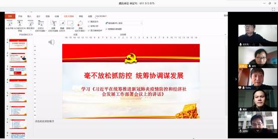 支部成员纷纷对习总书记的讲话精神分享了自己的学习体会。黄涛副书记认为此次抗疫过程中,体现出我们国家强大的战疫能力,展现出我们社会主义制度的制度优势,使我们更加坚定四个自信。目前已经进到疫情防控的决胜阶段,但还没有到结束阶段,一手抓疫情防控,一手抓稳定生产,两手都要抓,确保我们的疫情防控和教学科研工作,有序进行。吴和林老师表达了对一线医护人员、志愿者、基层党员干部的无私付出的崇高敬意。杨勇老师谈到,此次抗疫工作,充分体现了以习近平同志为中心的党中央,抗疫工作部署及时具体,指导有力。中国人民不可战胜,一方有难八方支援,疫情终将被战胜。最后,吴绍靖副主任分享了此次抗疫充分体现了在中国共产党的领导下集中力量办大事的制度优势,同时结合疫情期间,教育信息化服务于教学过程中,暴露出一些问题,对我们当前工作提出了新的要求。他指出,如何通过信息技术、大数据等手段,将教学与科研相结合,保证教学效果,是我们每个从事教育信息化科研工作者的使命。
