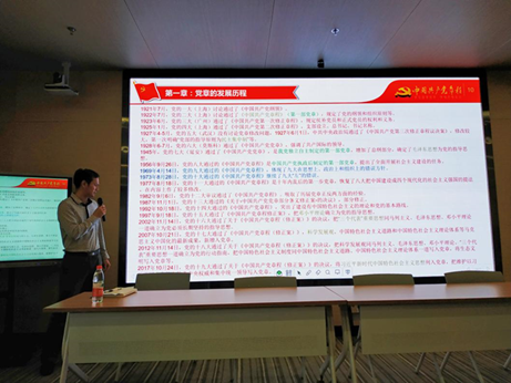 11月9日下午,工程中心党委副书记黄涛带领大家进行了《中国共产党章程》的学习,他介绍了党章在党内法规中的地位、作用、性质和发展历程,重点讲解了党的十九大对党章的主要修改及其重大意义,并对党章的总纲和条文进行了详细的解读。