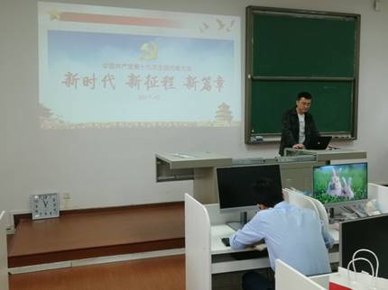 安浩杨同志还带领大家学习了党的十九大报告。首先学习了中国共产党在十个方面取得的历史性成就,即经济建设取得重大成就、全面深化改革取得重大突破、民主法治建设迈出重大步伐、思想文化建设取得重大进展、人民生活不断改善、生态文明建设成效显著、强军兴军开创新局面、港澳台工作取得新进展、全方位外交布局深入展开以及全面从严治党成效卓著。随后介绍了中国共产党实现中华民族伟大复兴的的历史使命,以及“四个伟大”——即伟大事业、伟大斗争、伟大工程和伟大梦想的具体内涵。安浩杨指出,支部全体党员同志一定要牢记使命,认真学习和贯彻习近平新时代中国特色社会主义思想和党的十九大精神,坚持学习并提升自身专业水平。